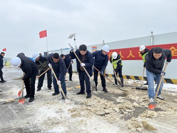 活動現(xiàn)場,大家手持鐵鍬、掃帚等工具,分工協(xié)作,有序地對項目現(xiàn)場作業(yè)區(qū)域的主要通道積雪進行清理。經(jīng)過一小時多的辛勤勞動,項目現(xiàn)場主要區(qū)域的積雪被有效清除,通行安全和作業(yè)環(huán)境得到切實改善,為項目在極端天氣下的有序推進提供了保障。